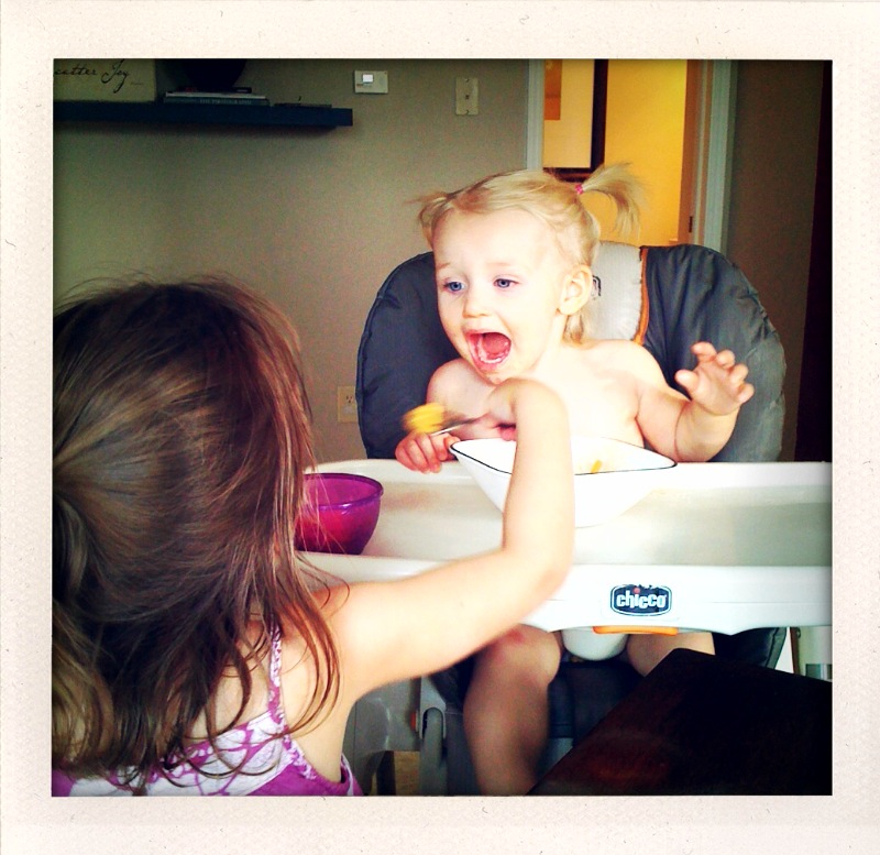 I got a new app on my phone that gives my mediocre phone photos a cute vintage polaroid look & I love it! I took these photos with the new app on my phone when Sammi decided to feed Natalie her mac n cheese, which both girls found to be hilarious!